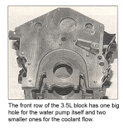 The 3.5L block is cast iron and shares the same bore centers and stroke with the older 3.3L pushrod engine, but the bores are larger. The 3.5L displaces 3518 cc's with a bore and stroke of 3.78 in. (96 mm) by 3.19 in. (81 mm). The front of the 3.5L block is different from the 3.3L so it can accommodate a different oil pump, water pump and the overhead cam timing belt drive and cover. The water pump bypass is internal to the block.